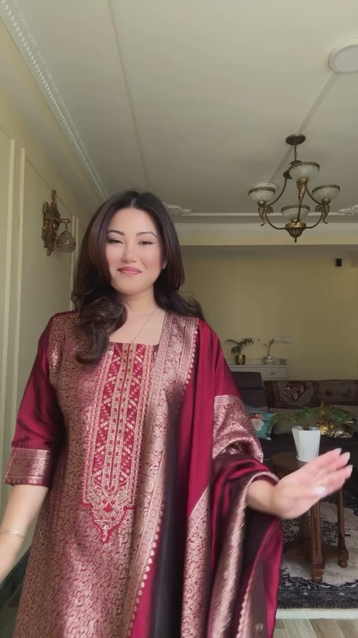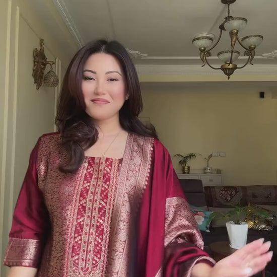 Experience luxury with our Pure Banarasi Suit Set, crafted with Jacquard weaving, hand zari work, and elegant design patterns. This set brings together rich tradition and modern festive charm—perfect for weddings, gatherings, and celebrations.